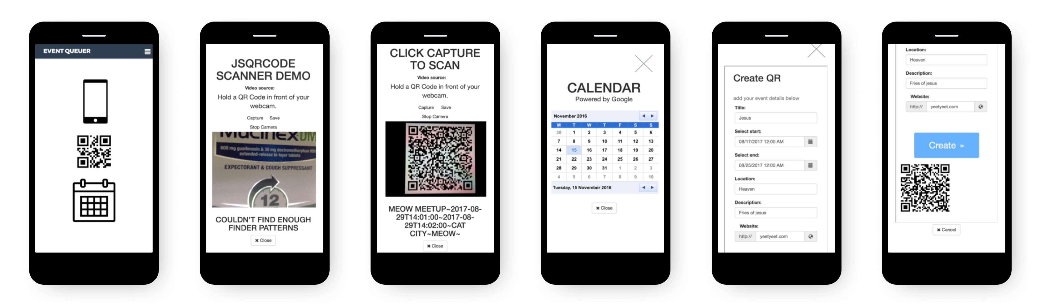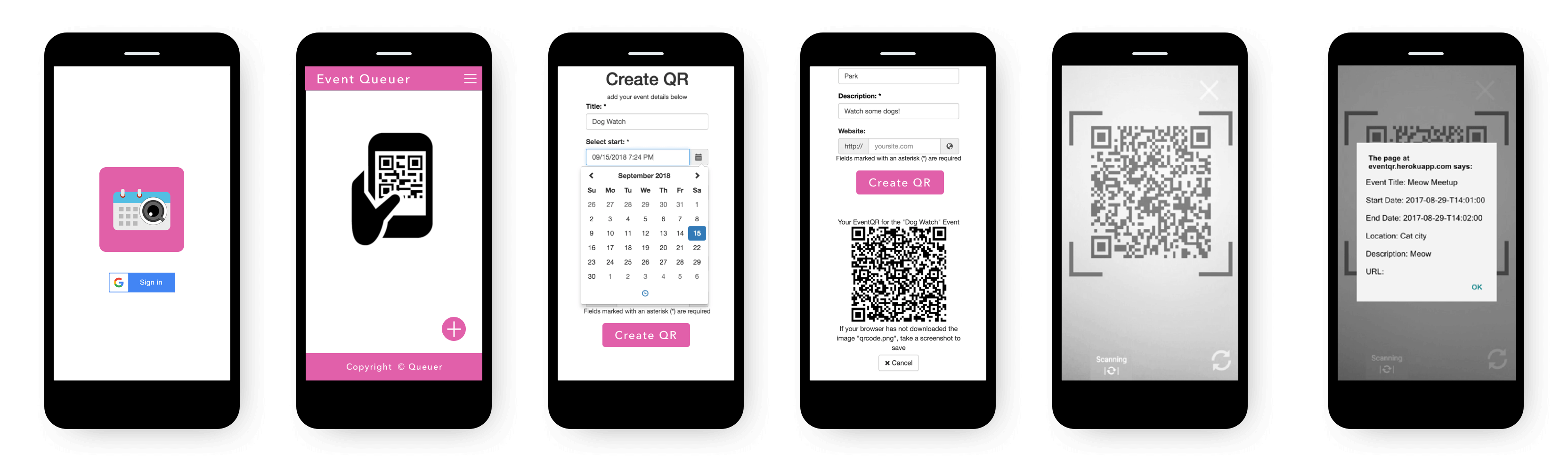 Event Queuer is a mobile web app that lets users share calendar events through QR codes. It can encode event details into a QR code and scan an "event QR code," which syncs the details into the user's Google Calendar.