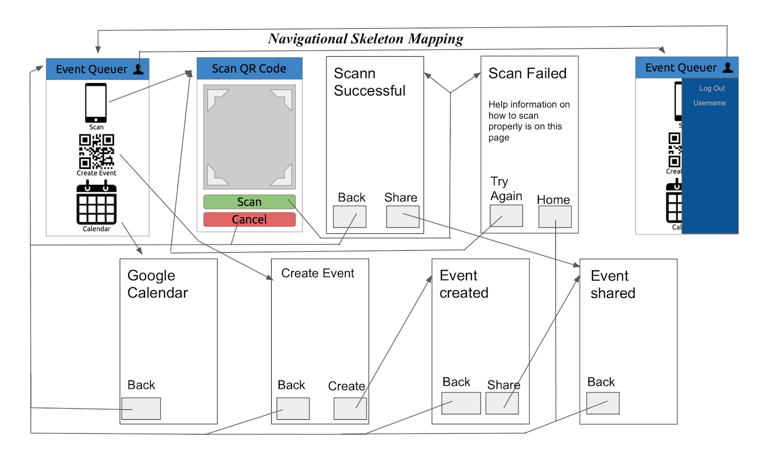 With the feedback, I simplified the UI in the lofi wireframes. I created a single level navigation framework for each of the features. The "Create event" and "Scan event" functions were now on the same visual hierarchy.