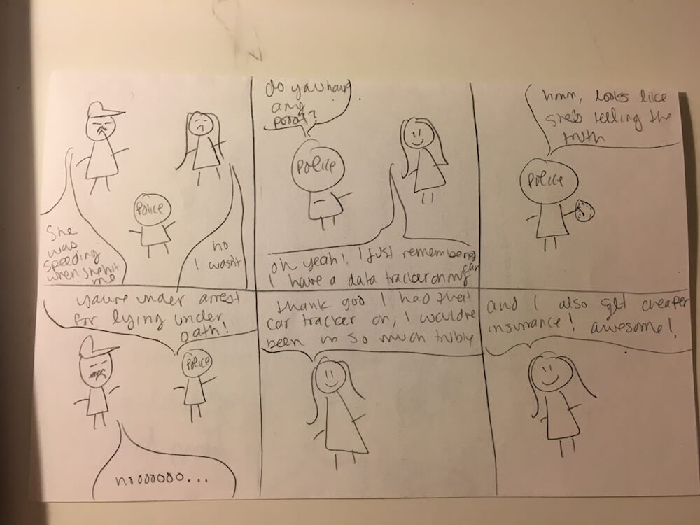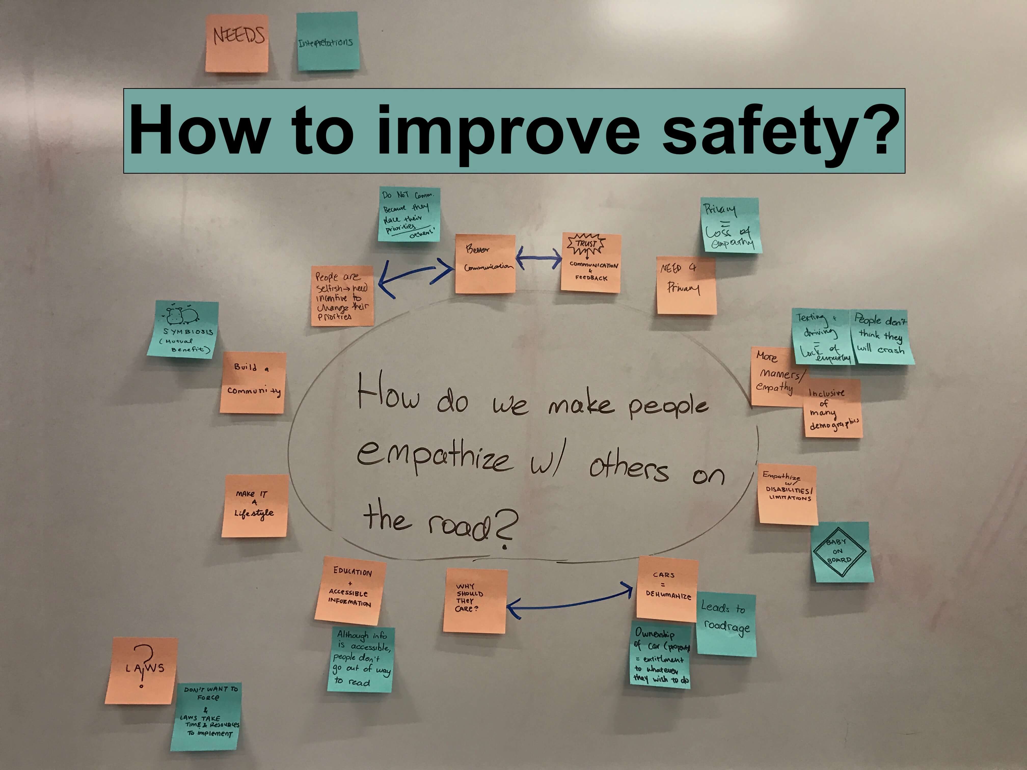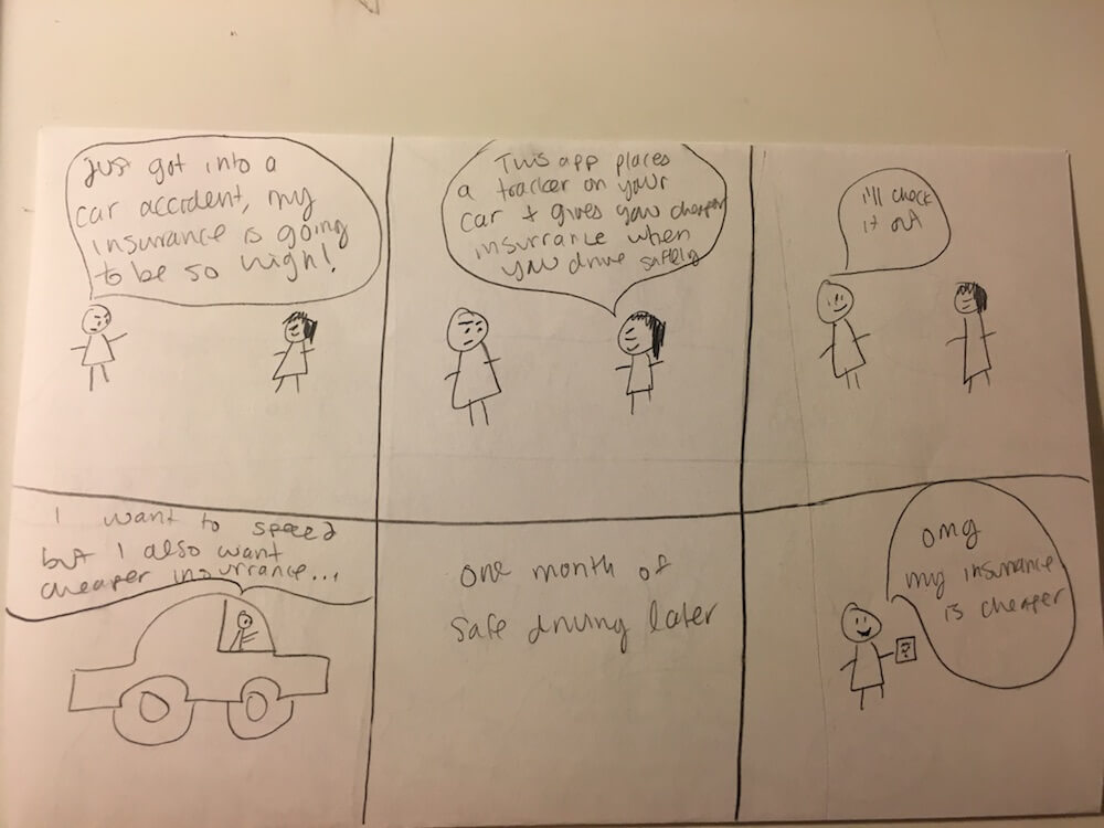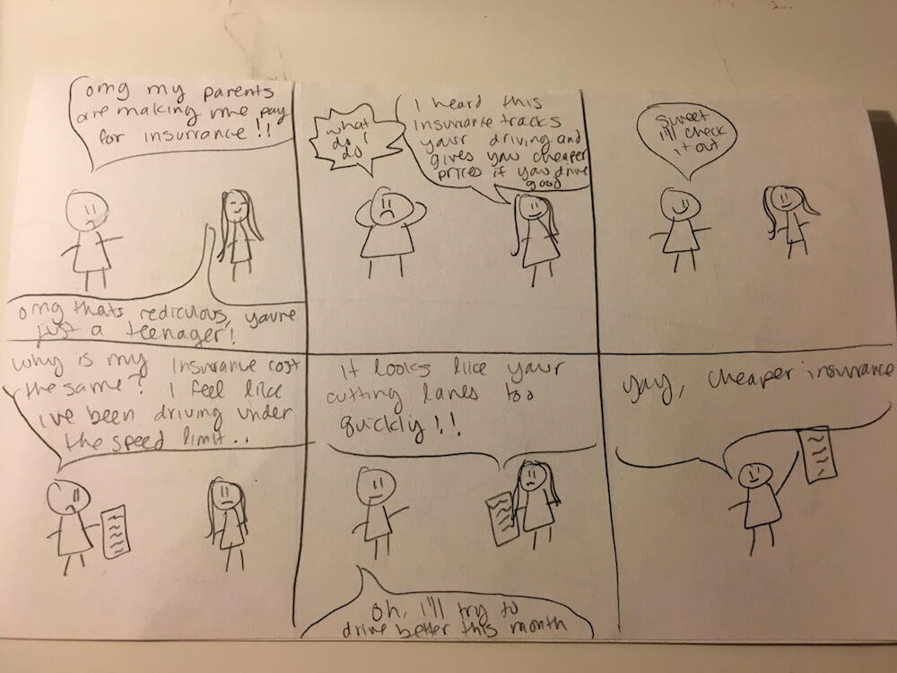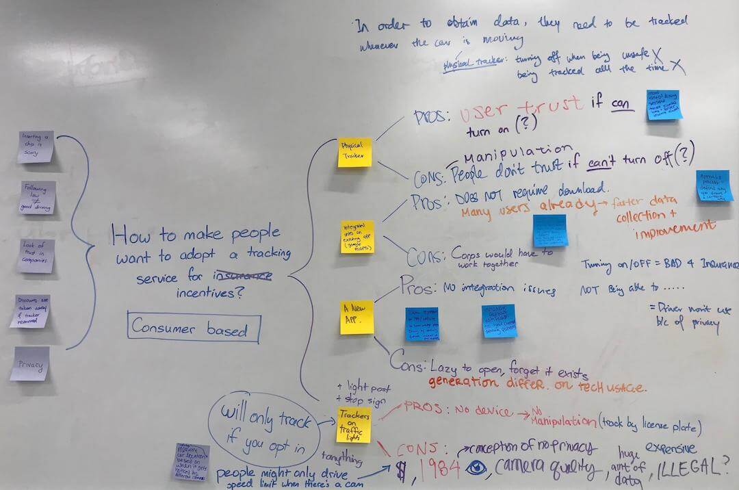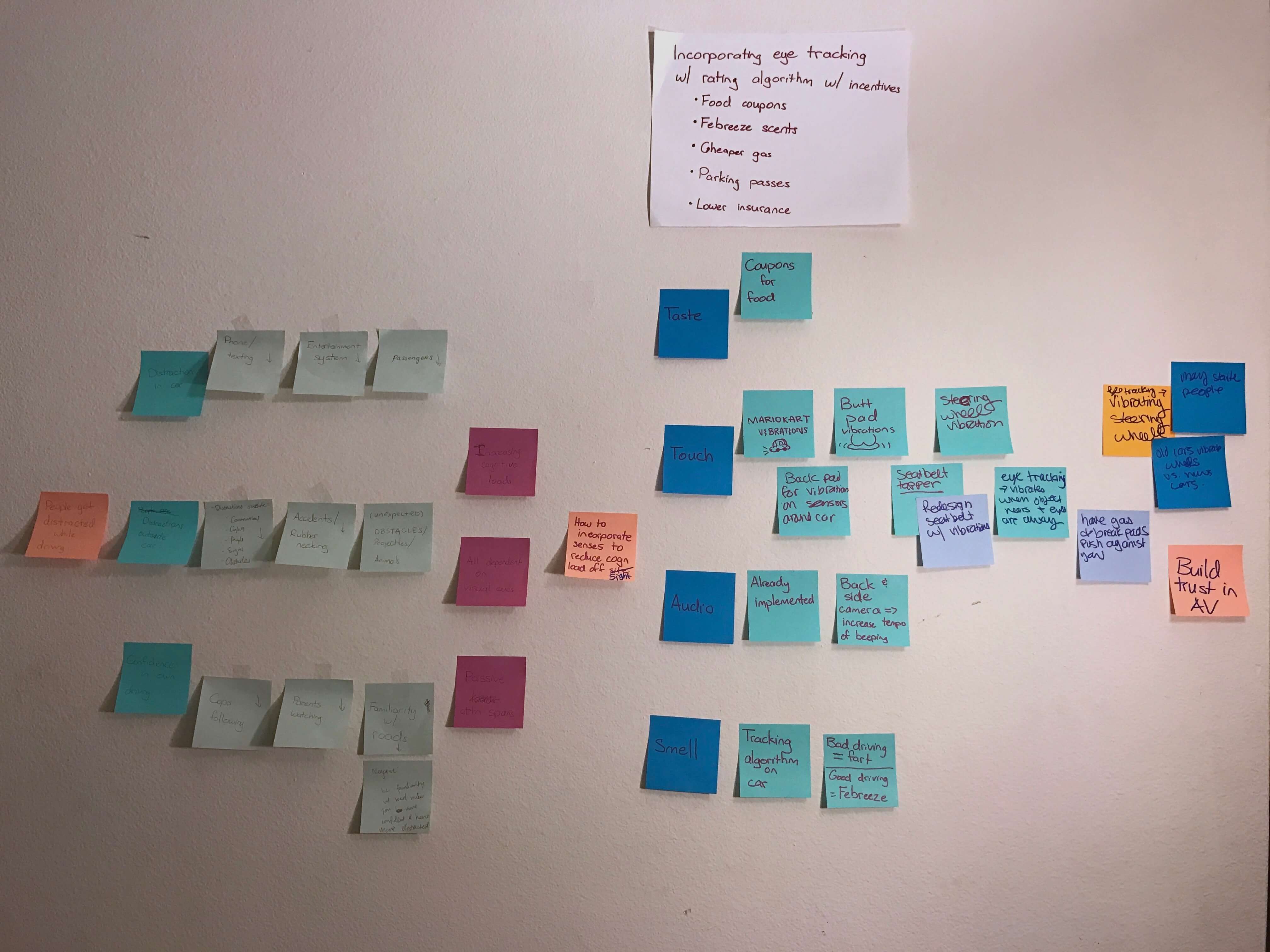 We clustered common user needs from our research together. Many accidents were caused by drivers not paying attention to their surroundings. There was a repeating pattern in how users allowed themselves to engage with distractions- like using their phones or talking with someone.