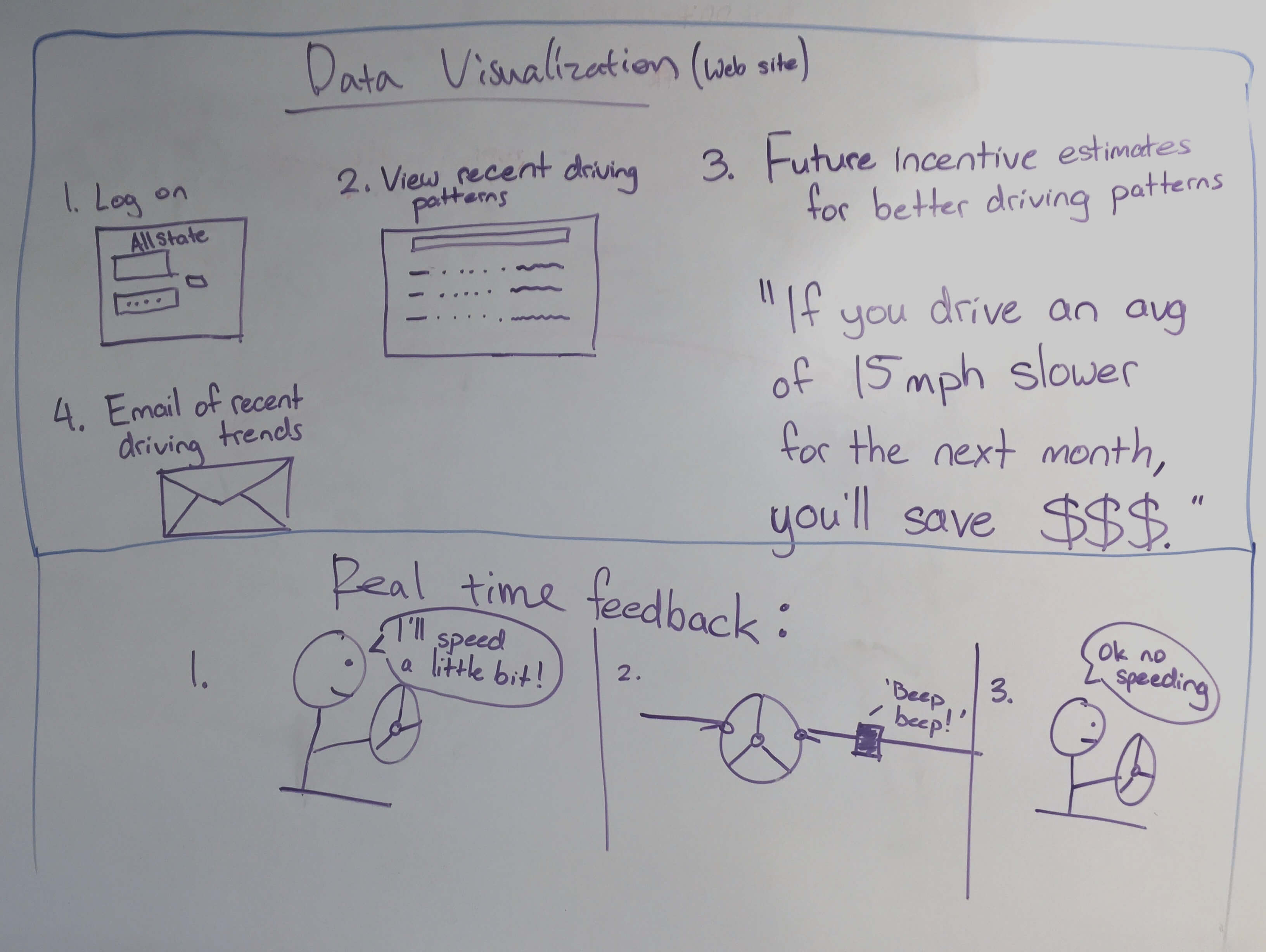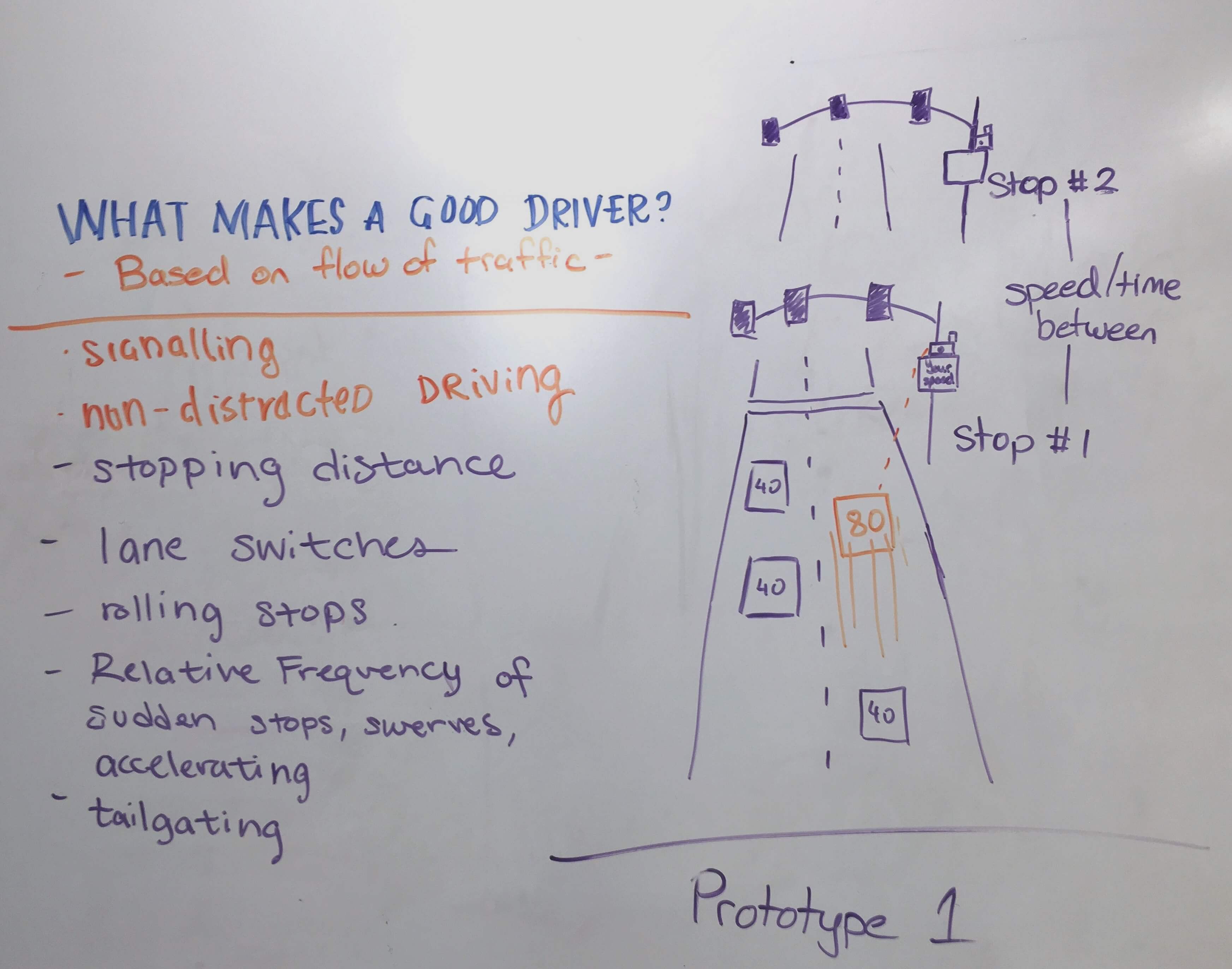 Idea 1: Track data by using cameras built into stop lights. They would track a driver’s license plate if they opt in and users can log onto a website to see everything. There are huge cost and feasibility issues with this idea.